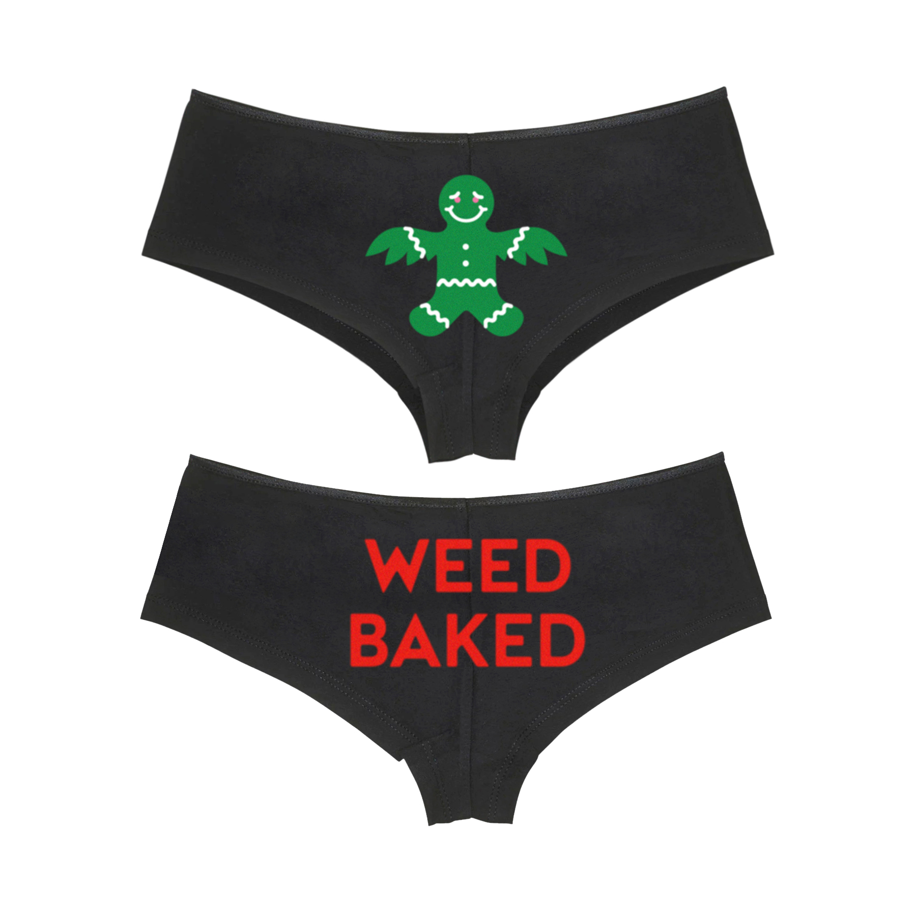 This Boy Short underwear with a gingerbread man graphic printed on the front and a weed baked graphic printed on the back. :)